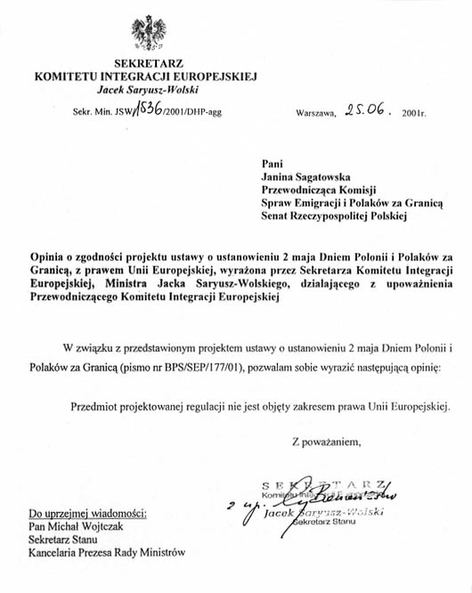 Senat, mając to na względzie, postanowił obecnie podjąć inicjatywę ustawodawczą o ustanowieniu 2 maja Dniem Polonii i Polaków za Granicą.