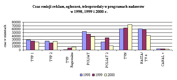 enia przepisów regulujących działalność reklamową i sponsorską dotyczyły przede wszystkim niedokładności w prowadzonej ewidencji wyemitowanych reklam. W zakresie działalności sponsorskiej naruszenia dotyczyły przekroczenia czasu wskazań sponsora, a także sposobu ich oznaczania.Czas emisji reklam w latach 1998 - 2000 przedstawia poniższa tabela.