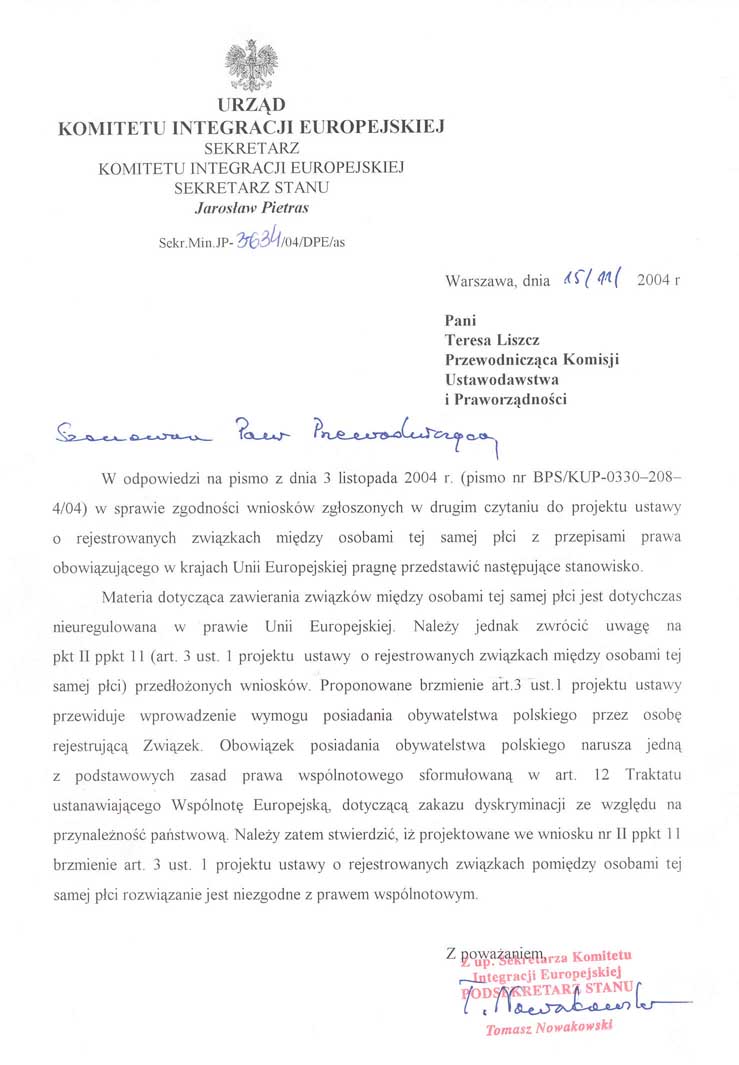 Komisje, na wspólnym posiedzeniu w dniu 18 listopada 2004 r. - po rozpatrzeniu przedstawionego projektu ustawy oraz wniosków zgłoszonych w toku dyskusji podczas drugiego czytania - poparły wnioski zawarte w pkt II ppkt: 3, 6, 8, 18, 19, 20, 22, 23, 26, 27, 29, 31, 33 i 37 i wnoszą o ich przyjęcie przez Senat wraz z jednolitym projektem ustawy o rejestrowanych związkach między osobami tej samej płci oraz projektem uchwały w sprawie wniesienia do Sejmu tego projektu ustawy, zawartymi w druku nr 548 S.