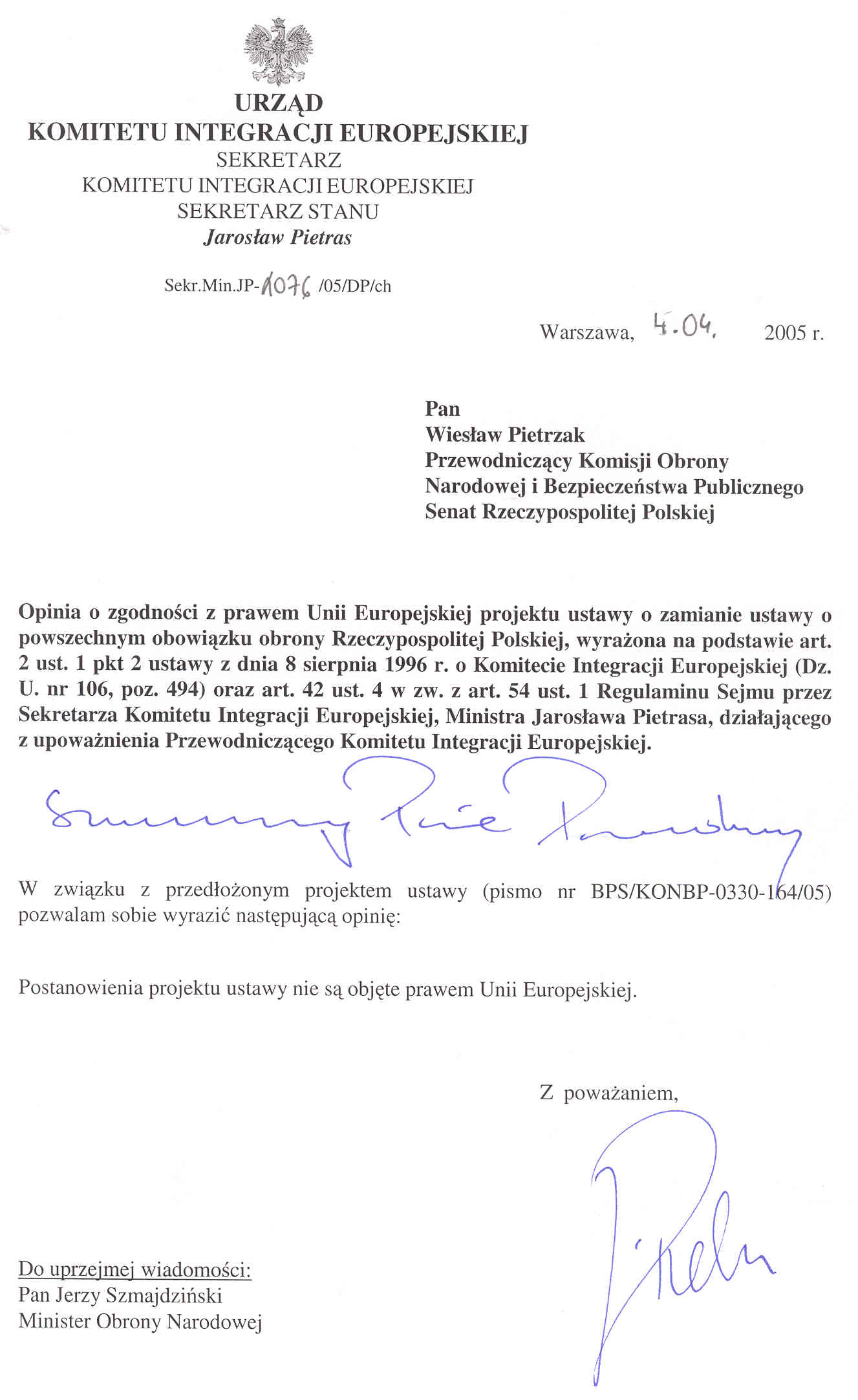 Komisje, na wspólnym posiedzeniu w dniu 27 kwietnia 2005 r. - zgodnie z art. 80 ust. 1, 2 i 3 Regulaminu Senatu - po rozpatrzeniu w pierwszym czytaniu projektu ustawy wnoszą o przyjęcie bez poprawek przedstawionego przez wnioskodawców i załączonego projektu ustawy o zmianie ustawy o powszechnym obowiązku obrony Rzeczypospolitej Polskiej oraz projektu uchwały w sprawie wniesienia do Sejmu tego projektu ustawy.