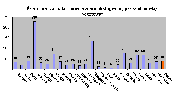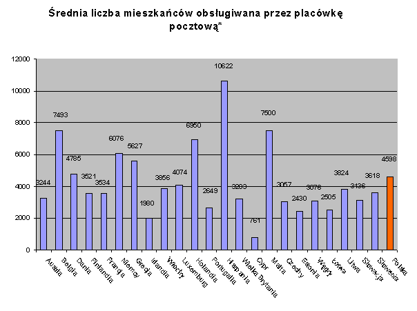 2 i 4.598,5 mieszkańców. Zamieszczony poniżej wykres ilustruje wartości wskaźników określających dostępność placówek pocztowych w Polsce na tle innych krajów.