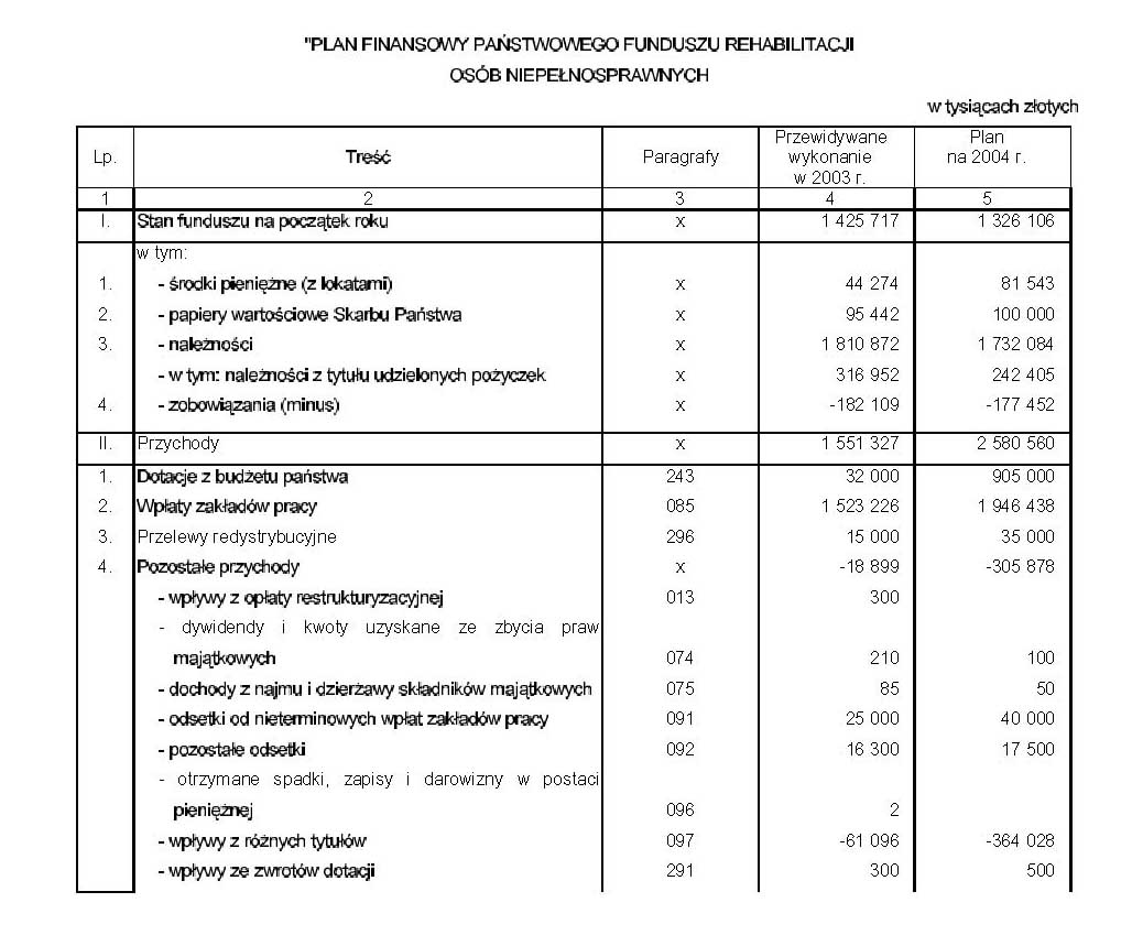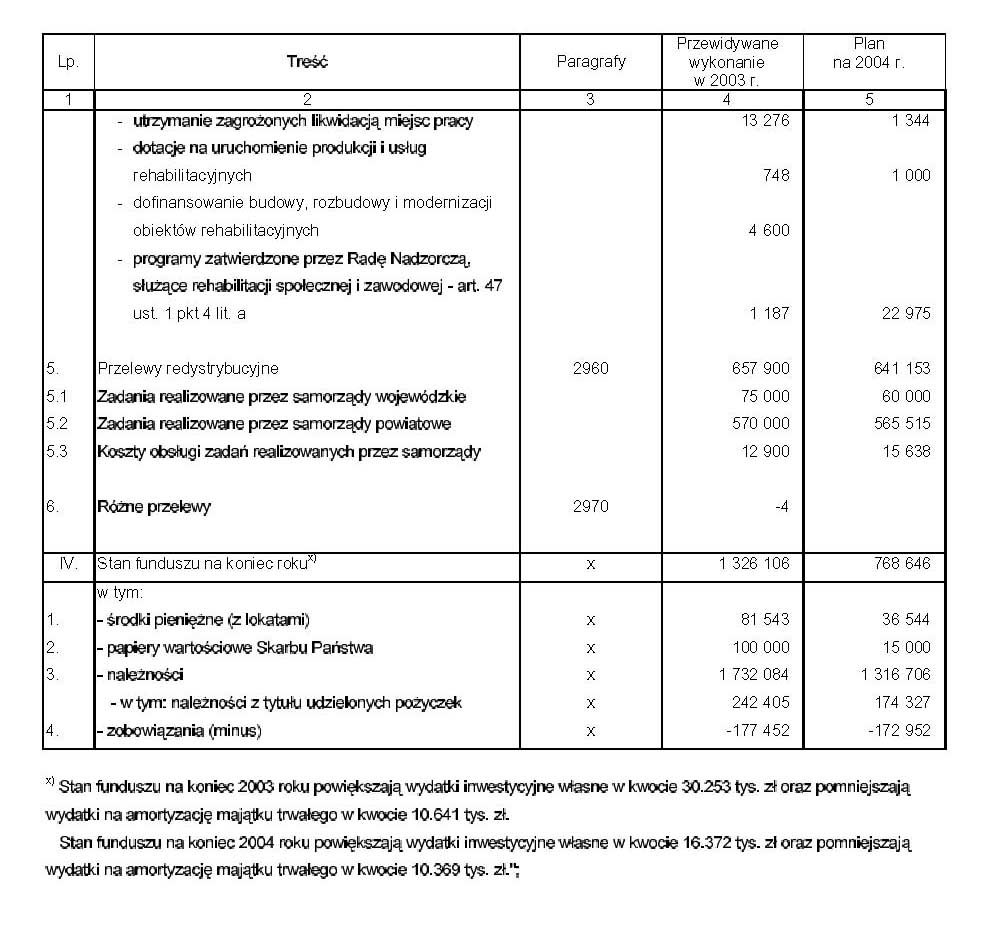 a) w załączniku nr 2: - w części 44 Zabezpieczenie społeczne w rozdziale 85324 - Państwowy Fundusz Rehabilitacji Osób Niepełnosprawnych, zwiększa się dotacje i subwencje o 155.000 tys. zł, - w części 83 Rezerwy celowe skreśla się poz. 70, b) w załączniku nr 5 tabela - Plan finansowy Państwowego Funduszu Rehabilitacji Osób Niepełnosprawnych otrzymuje brzmienie: |