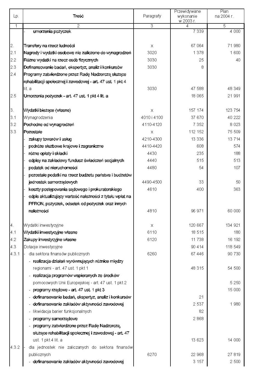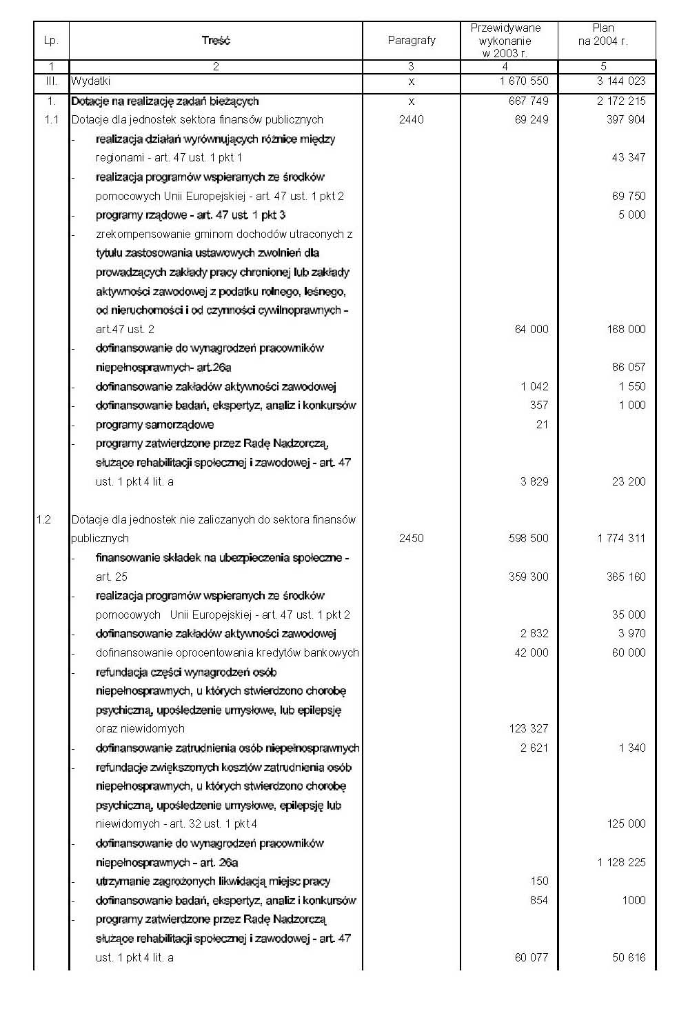 a) w art. 1 dochody i wydatki budżetu państwa zmniejsza się o 1.042.792 tys. zł, b) w art. 45 ust. 1 otrzymuje brzmienie: "1. Ze środków specjalnych gromadzonych na podstawie odrębnych ustaw przez państwowe jednostki budżetowe, z wyjątkiem środków specjalnych ujętych w częściach budżetu państwa, których dysponentami są wojewodowie, ministrowie wł aściwi do spraw: kultury fizycznej i sportu, wewnętrznych, administracji publicznej oraz nauki, a także środków specjalnych, o których mowa w art. 16a ustawy z dnia 26 kwietnia 1996 r. o Służbie Więziennej (Dz.U. z 2002 r. Nr 207, poz. 1761, z późn. zm.), w art. 43 ustawy z dnia 6 czerwca 1997 r. - Kodeks karny wykonawczy (Dz.U. Nr 90, poz. 557, z późn. zm.), w art. 7 ust. 2 ustawy z dnia 28 sierpnia 1997 r. o zatrudnianiu osób pozbawionych wolności (Dz.U. Nr 123, poz. 777 i z 2003 r. Nr 202, poz. 1957), art. 8a ust. 3 ustawy z dnia 21 czerwca 1996 r. o urzędach i izbach skarbowych (Dz.U. Nr 106, poz. 489, z późn. zm.), w art. 36 ust. 5 ustawy z dnia 14 marca 1985 r. o Państwowej Inspekcji Sanitarnej (Dz.U. z 1998 r. Nr 90, poz. 575, z późn. zm.), w art. 11 ustawy z dnia 25 maja 2001 r. o przebudowie i modernizacji technicznej oraz finansowaniu Sił Zbrojnych Rzeczypospolitej Polskiej w latach 2001-2006 (Dz.U. Nr 76, poz. 804, z późn. zm.), w art. 50a ustawy z dnia 30 sierpnia 1991 r. o zakładach opieki zdrowotnej (Dz.U. Nr 91, poz. 408, z późn. zm.), w art. 1 ust. 4 i w art. 4 ustawy z dnia 7 października 1992 r. o regionalnych izbach obrachunkowych (Dz.U. z 2001 r. Nr 55, poz. 577, z późn. zm.), w art. 26 ustawy z dnia 3 lipca 2002 r. - Prawo lotnicze (Dz.U. Nr 130, poz. 1112 i z 2003 r. Nr 210, poz. 2036), w art. 9a ustawy z dnia 10 czerwca 1994 r. o zamówieniach publicznych (Dz.U. z 2002 r. Nr 72, poz. 664, z późn. zm.), w art. 47b ust. 1 pkt 1 i ust. 1a ustawy z dnia 29 lipca 1992 r. o grach i zakładach wzajemnych (Dz.U. z 1998 r. Nr 102, poz. 650, z późn. zm.), dokonuje się wpłaty do budżetu państwa w wysokości 15% uzyskanych wpływów.",c) w załączniku nr 1 i 4 zmniejsza się dochody z wpłat do budżetu ze środków specjalnych: - w części 16 Kancelaria Prezesa Rady Ministrów o 2.533 tys. zł, - w części 17 Administracja publiczna o 26.001 tys. zł, - w części 19 Budżet, finanse publiczne i instytucje finansowe w dziale 750 - Administracja publiczna o 295.750 tys. zł, - w części 21 Gospodarka morska: w dziale 600 - Transport i łączność o 148 tys. zł oraz w dziale 750 - Administracja publiczna o 50 tys. zł, - w części 22 Gospodarka wodna o 400 tys. zł, - w części 24 Kultura i ochrona dziedzictwa narodowego: w dziale 801 - Oświata i wychowanie o 310 tys. zł, w dziale 854 - Edukacyjna opieka wychowawcza o 26 tys. zł oraz w dziale 921 - Kultura i ochrona dziedzictwa narodowego o 48.431 tys. zł, - w części 28 Nauka w dziale 730 - Nauka o 70.678 tys. zł, - w części 29 Obrona narodowa: w dziale 752 - Obrona narodowa o 50.277 tys. zł oraz w dziale 851 - Ochrona zdrowia o 381 tys. zł, - w części 30 Oświata i wychowanie w dziale 801 - Oświata i wychowanie o 528 tys. zł, - w części 31 Praca w dziale 750 - Administracja publiczna o 375 tys. zł, - w części 32 Rolnictwo: w dziale 010 - Rolnictwo i łowiectwo o 279 tys. zł oraz w dziale 050 Rybołówstwo i rybactwo o 62 tys. zł, - w części 36 Skarb Państwa w dziale 758 - Różne rozliczenia o 417.978 tys. zł, - w części 37 Sprawiedliwość w dziale 755 - Wymiar sprawiedliwości o 27.970 tys. zł, - w części 39 Transport w dziale 600 - Transport i łączność o 32.332 tys. zł, - w części 41 Środowisko: w dziale 710 - Działalność usługowa o 1.646 tys. zł oraz w dziale 900 - Gospodarka komunalna i ochrona środowiska o 669 tys. zł, - w części 42 Sprawy wewnętrzne w dziale 754 - Bezpieczeństwo publiczne i ochrona przeciwpożarowa o 640 tys. zł, - w części 45 Sprawy zagraniczne w dziale 750 - Administracja publiczna o 6.085 tys. zł, - w części 46 Zdrowie w dziale 851 - Ochrona zdrowia o 40.496 tys. zł, - w części 49 Urząd Zamówień Publicznych o 2.708 tys. zł, - w części 58 Główny Urząd Statystyczny: w dziale 150 - Przetwórstwo przemysłowe o 128 tys. zł, w dziale 720 - Informatyka o 405 tys. zł oraz w dziale 750 - Administracja publiczna o 227 tys. zł, - w części 65 Polski Komitet Normalizacyjny o 2.005 tys. zł, - w części 69 Komisja Papierów Wartościowych i Giełd o 37 tys. zł, - w części 76 Urząd Regulacji Telekomunikacji i Poczty o 12.441 tys. zł, - w części 80 Regionalne izby obrachunkowe o 796 tys. zł, d) w załączniku nr 2: - w części 28 Nauka w rozdziale 73005 - Działalność statutowa i inwestycyjna jednostek naukowych oraz badania własne szkół wyższych, zmniejsza się wydatki majątkowe o 100.000 tys. zł, - w części 38 Szkolnictwo wyższe w rozdziale 80306 - Działalność dydaktyczna, zmniejsza się wydatki majątkowe o 200.000 tys. zł, - w części 83 Rezerwy celowe: w poz. 11 zmniejsza się wydatki majątkowe o 350.000 tys. zł, w poz. 63 zmniejsza się wydatki majątkowe o 90.000 tys. zł, w poz. 71 zmniejsza się dotacje i subwencje o 358.000 tys. zł oraz w poz. 72 zmniejsza się wydatki bieżące jednostek budżetowych o 44.792 tys. zł, e) w załączniku nr 2 w części 83 Rezerwy celowe: - w poz. 11 w kol. 4 tiret pierwsze otrzymuje brzmienie: "- nie mniej niż 50.000 tys. zł na budowę metra w Warszawie", - w poz. 71 kol. 4 otrzymuje brzmienie: "Środki przeznaczone dla PKP S.A. na inwestycje w tabor dla przewozów regionalnych oraz modernizacje i remonty linii kolejowych o znaczeniu regionalnym",- dodaje się poz. 77 w brzmieniu: |