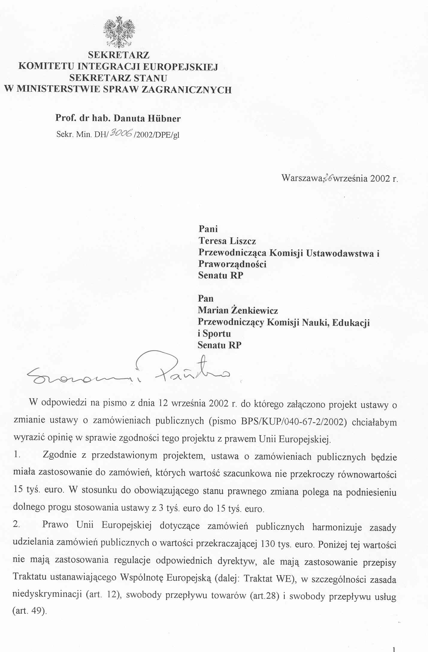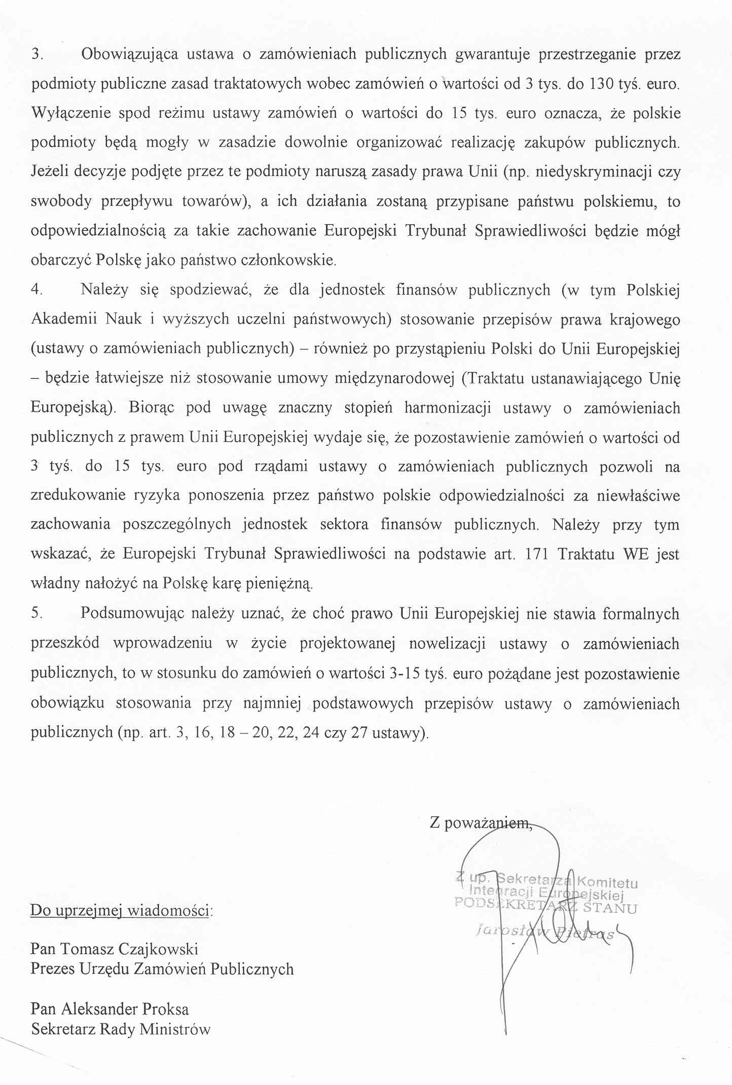 W kontekście przystąpienia Polski do Unii Europejskiej należy zwrócić uwagę na fakt, że podwyższenie "progu" z 3 000 do 15 000 euro zbliża ustawodawstwo polskie do obowiązującego w tym zakresie prawodawstwa unijnego.