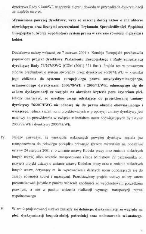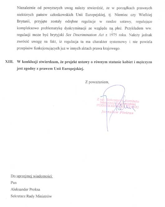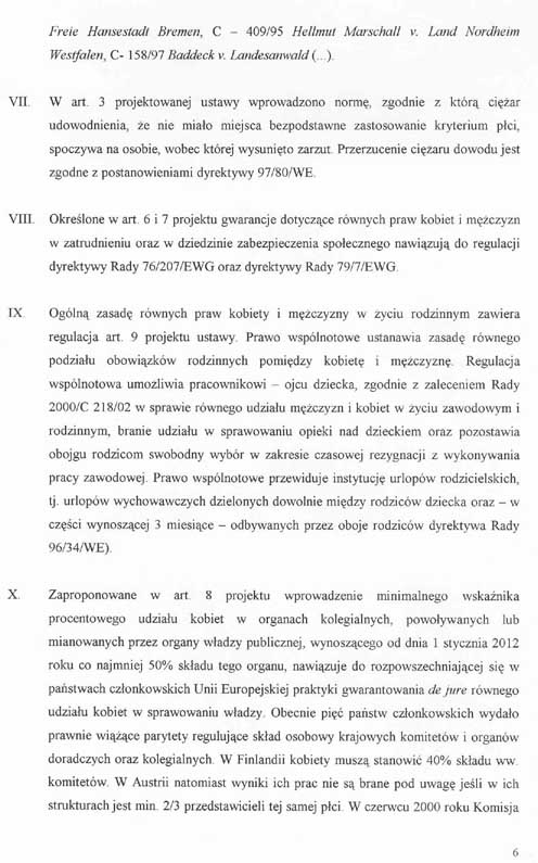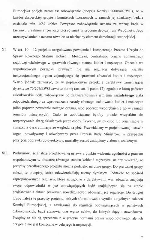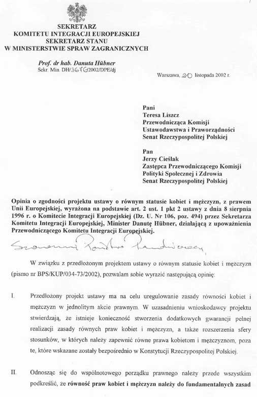 wprowadziły poprawki do przedstawionego przez wnioskodawców projektu ustawy i wnoszą o przyjęcie przez Senat jednolitego, załączonego projektu ustawy o równym statusie kobiet i mężczyzn, wraz z projektem uchwały w sprawie wniesienia do Sejmu tego projektu ustawy.W załączeniu przedstawiamy także informację o zgodności projektu ustawy z prawem Unii Europejskiej.