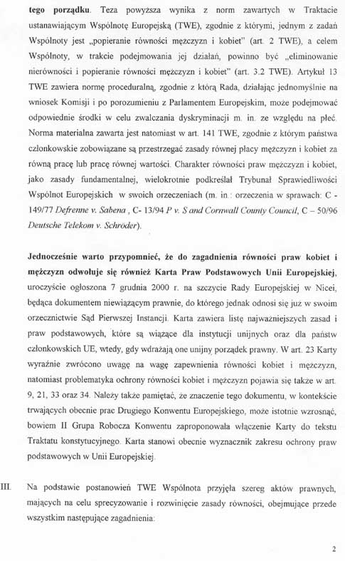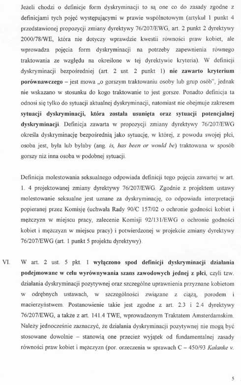 2) wprowadzania pozornie neutralnych regulacji prawnych, kryteriów lub praktyk, które mogą doprowadzić do szczególnej niekorzystnej sytuacji dla osób określonej płci w stosunku do osób płci przeciwnej, chyba że taka regulacja prawna, kryterium lub praktyka jest obiektywnie uzasadniona usankcjonowanym prawnie celem, a środki mające służyć osiągnięciu tego cel