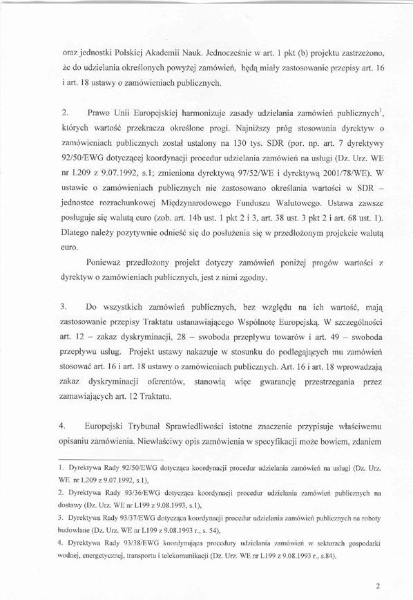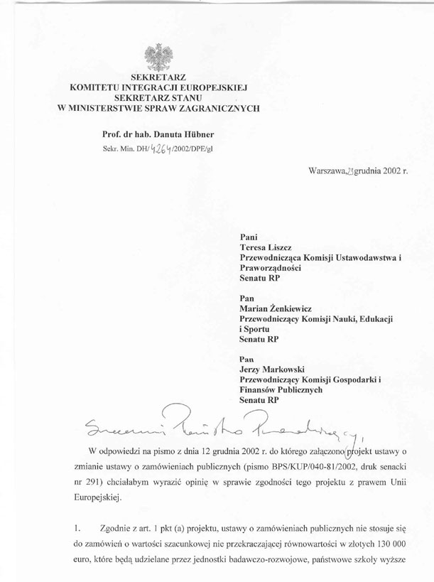 Proponowane zmiany są w pełni zgodne z dyrektywami Unii Europejskiej, gdyż dolny próg, od którego obowiązywałyby przetargi w jednostkach badawczo-rozwojowych, państwowych szkołach wyższych oraz Polskiej Akademii Nauk na dostawy i usługi wynosi 130 000 euro, tj. odpowiada progowi przyjętemu w krajach Unii. Ponadto nowelizacja odwołuj