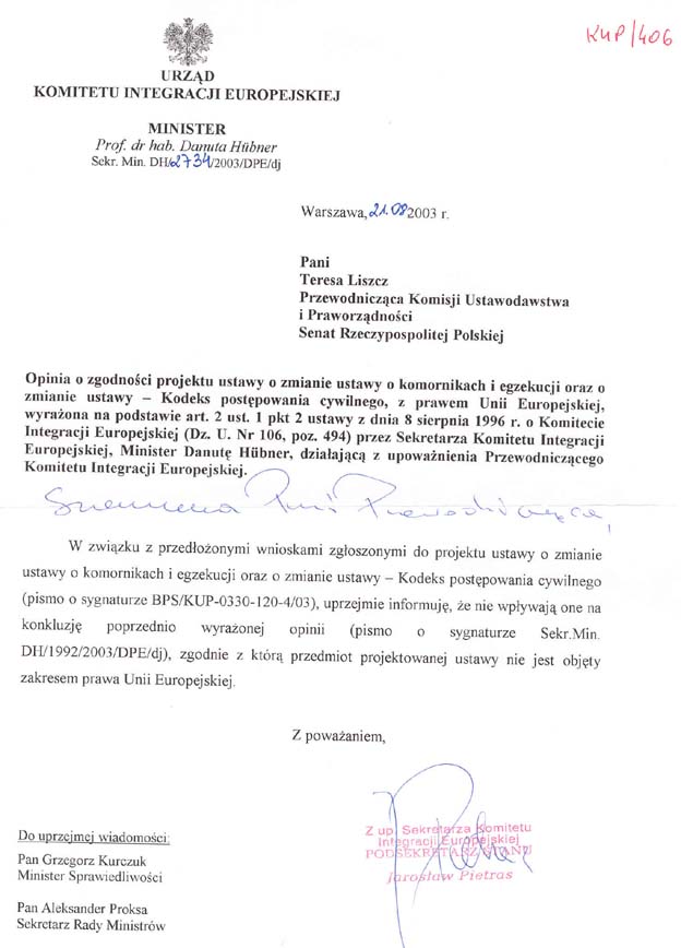 Senat na 44. posiedzeniu w dniu 7 sierpnia 2003 r. - po przeprowadzonym drugim czytaniu - zgodnie z art. 81 ust. 3 Regulaminu Senatu skierował projekt ustawy o zmianie ustawy o komornikach sądowych i egzekucji oraz o zmianie ustawy - Kodeks postępowania cywilnego do Komisji Ustawodawstwa i Praworządności, Komisji Polityki Społecznej i Zdrowia oraz Komisji Gospodarki i Finansów Publicznych.