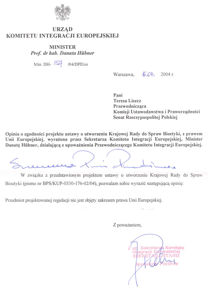 niejszy projekt ustawy opiera się na założeniach, opracowanych przez zespół wybitnych specjalistów z zakresu prawa medycznego: prof. Tadeusza L. Chruściela, prof. Leszka Kubickiego, dr Marka Nowickiego, prof. Marka Safjana i prof. Eleonorę Zielińską. Projekt przewiduje utworzenie Krajowej Rady do Spraw Bioetyki (określanej dalej mianem "Rada") jako organu opiniodawczo-doradczego w sprawach podstawowych problemów etycznych, prawnych i społecznych, które wyłaniają się w związku z postępem nauk biologicznych i medycznych. Zważywszy na fakt, iż usytuowanie Rady musi odpowiadać doniosłości problemów, którymi ma się zajmować, proponuje się, aby działała ona przy urzędzie Prezesa Rady Ministrów. Konsekwencją takiego stanowiska jest propozycja, aby obsługa techniczno-organizacyjna i budżetowa Rady należała do zadań Kancelarii Prezesa Rady Ministrów.Proponowany zakres działania Rady wskazuje na jej ekspercko-konsultacyjny charakter. Wydawane przez Radę opinie nie mają być bowiem formalnie wiążące - mogą stanowić jednak cenną wskazówkę interpretacyjną w procesach legislacyjnych oraz spełniać rolę informacyjno-edukacyjną. Ponadto do zakresu działania Rady należeć ma monitorowanie przestrzegania w Polsce obowiązujących standardów biomedycznych oraz współpraca z polski