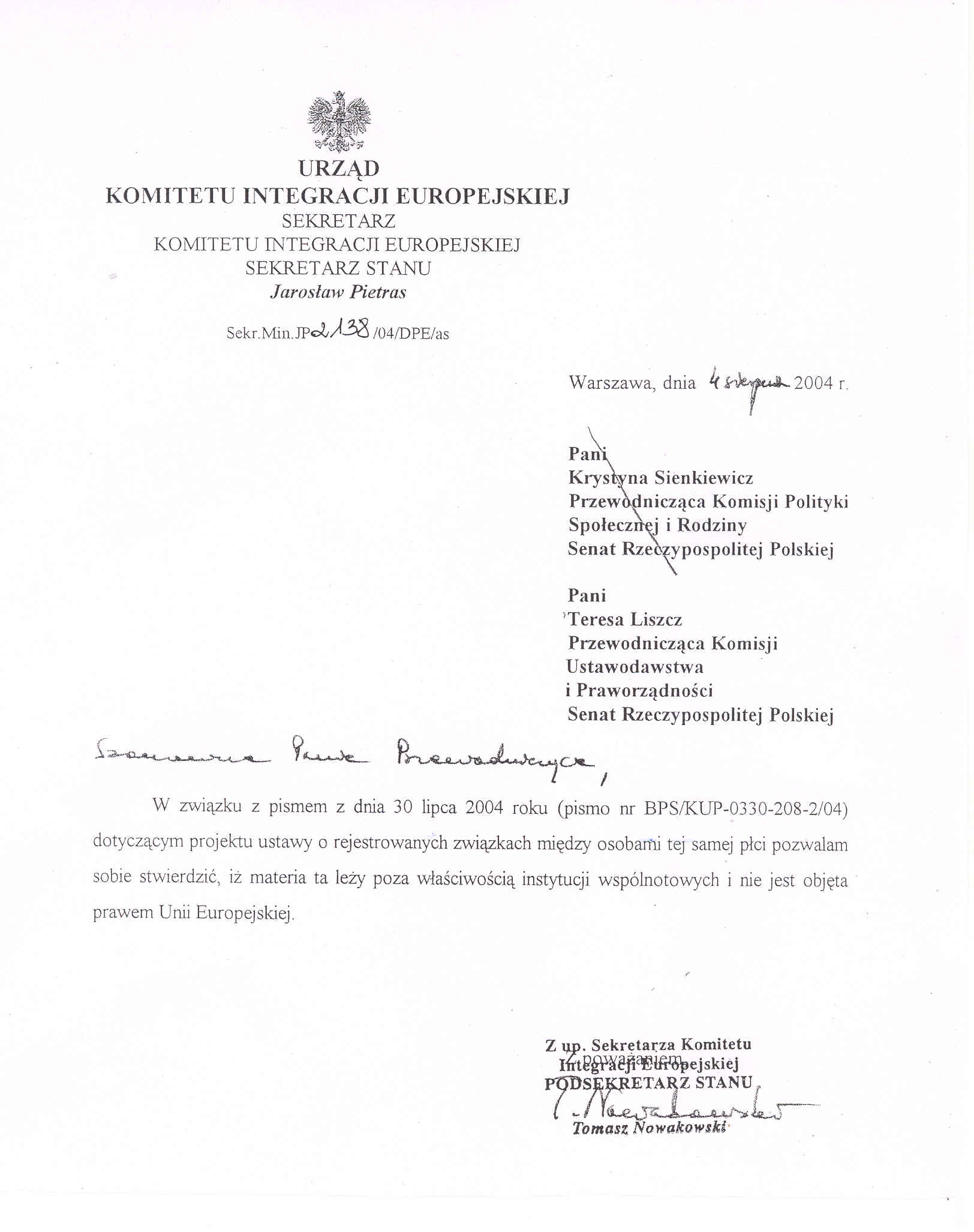 Komisje, na wspólnych posiedzeniach w dniach 10 lutego 2004 r. oraz 29 lipca 2004 r. - zgodnie z art. 80 ust. 2 i 4 Regulaminu Senatu - po rozpatrzeniu w pierwszym czytaniu projektu ustawy wprowadziły poprawki do przedstawionego przez wnioskodawców projektu ustawy i wnoszą o przyjęcie przez Senat jednolitego, załączonego projektu ustawy o rejestrowanych związkach między osobami tej samej płci oraz projektu uchwały w sprawie wniesienia do Sejmu tego projektu ustawy.