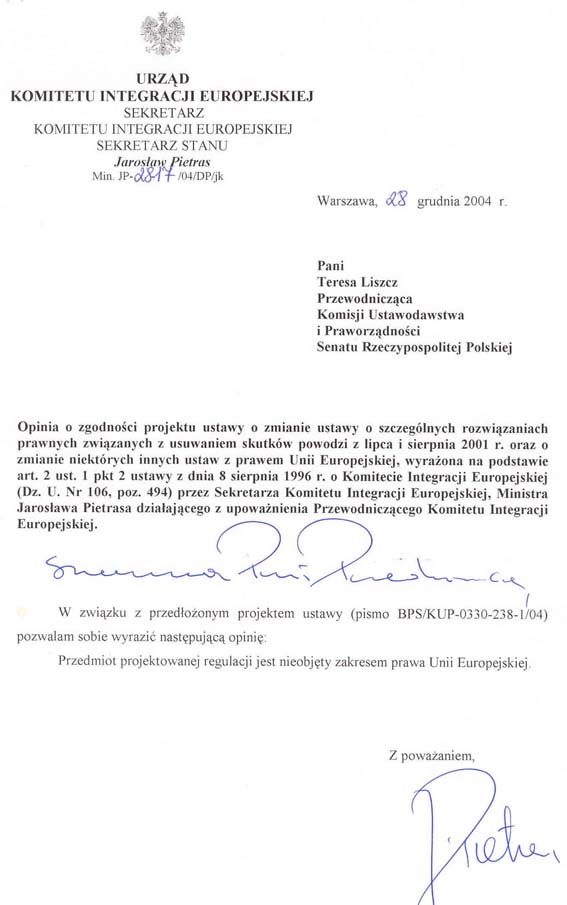 W załączeniu przedstawiamy także informację o zgodności projektu ustawy z prawem Unii Europejskiej.