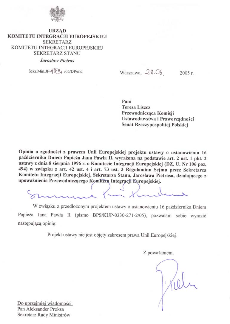 Komisja, na posiedzeniach w dniach 12 maja i 29 czerwca 2005 r. - zgodnie z art. 80 ust. 1, 2 i 3 Regulaminu Senatu - po rozpatrzeniu w pierwszym czytaniu projektu ustawy wprowadziła poprawkę do przedstawionego przez wnioskodawców projektu ustawy i wnosi o przyjęcie przez Senat jednolitego, załączonego projektu ustawy o ustanowieniu 16 października Dniem Papieża Jana Pawła II oraz projektu uchwały w sprawie wniesienia do Sejmu tego projektu ustawy.