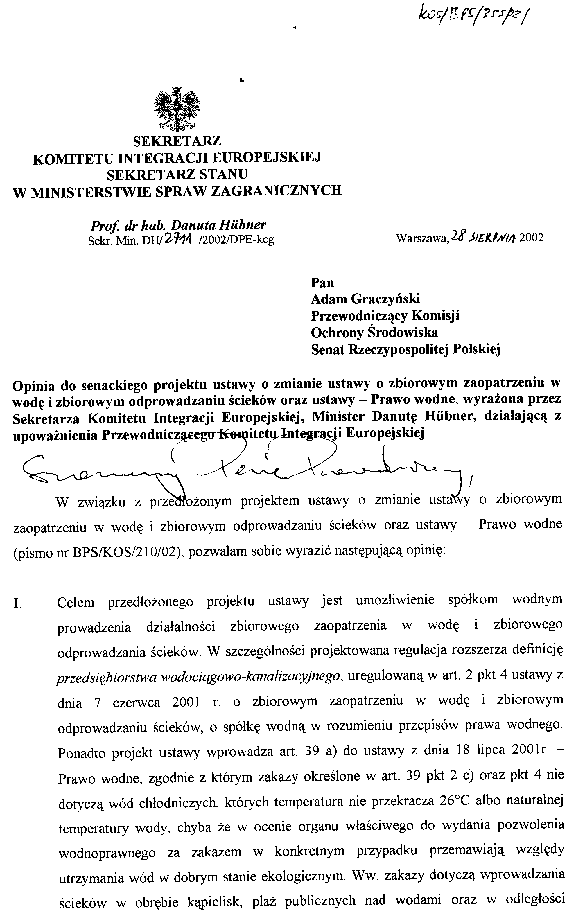 1 Konstytucji Rzeczypospolitej Polskiej z dnia 2 kwietnia 1997 r., Senat wnosi do Sejmu Rzeczypospolitej Polskiej projekt ustawy o zmianie ustawy o zbiorowym zaopatrzeniu w wodę i zbiorowym odprowadzaniu ścieków oraz ustawy - Prawo wodne.Jednocześnie upoważnia senatora Włodzimierza Łęckiego do reprezentowania stanowiska Senatu w dalszych pracach nad projektem.