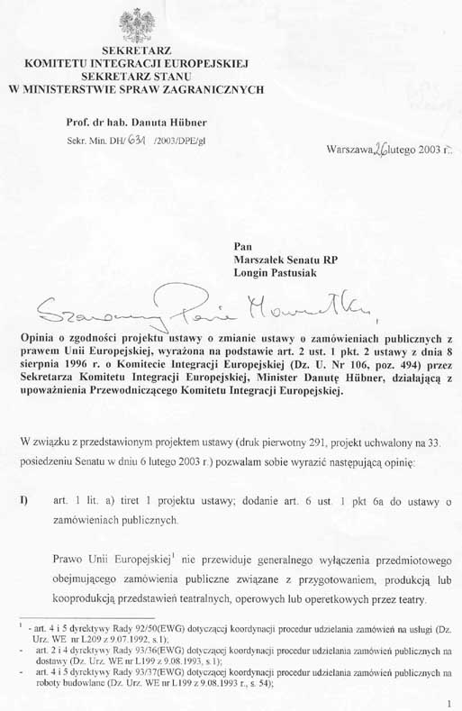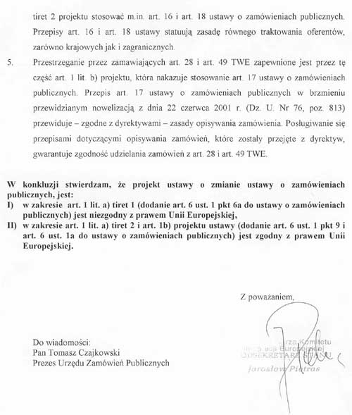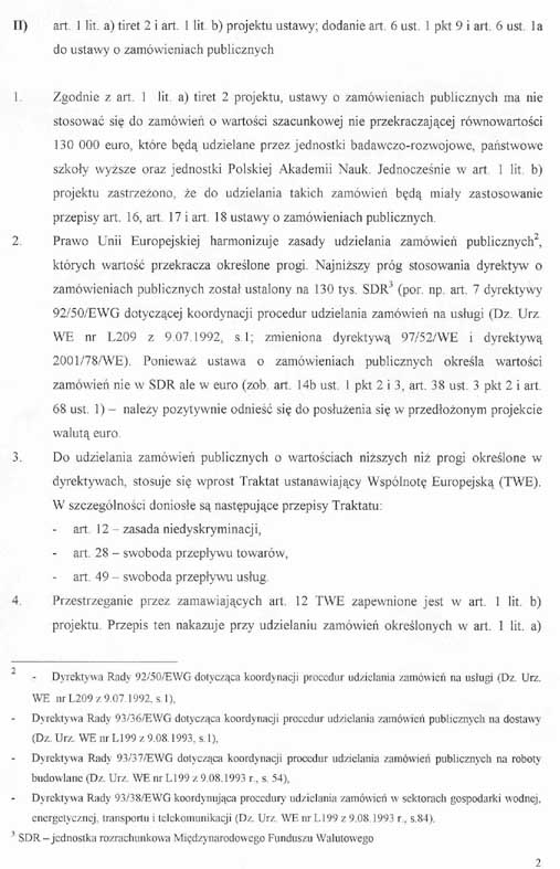Proponowane zmiany są w pełni zgodne z dyrektywami Unii Europejskiej, gdyż dolny próg, od którego obowiązywałyby przetargi w jednostkach badawczo-rozwojowych, państwowych szkołach wyższych oraz Polskiej Akademii Nauk na dostawy i usługi wynosi 130 000 euro, tj. odpowiada progowi przyjętemu w krajach Unii. Ponadto nowelizacja odwołuje się do przepisów rozdziału 2, art. 16, art. 17 i art. 18, tj. do zasady niedyskryminacji oraz zasady znoszenia preferencji krajowych, a także do przepisu określającego zasady opisywania przedmiotu zamówienia.