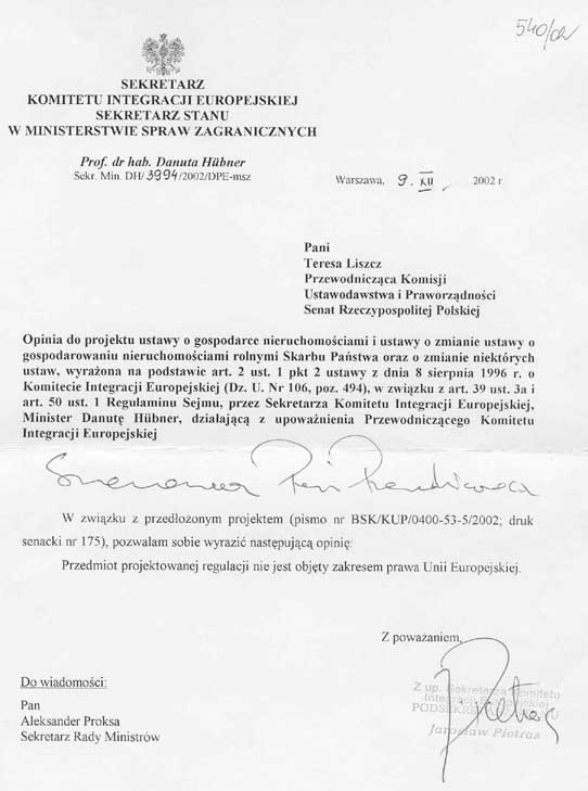 z dnia 2 kwietnia 1997 r., Senat wnosi do Sejmu Rzeczypospolitej Polskiej projekt ustawy o zmianie ustawy o gospodarce nieruchomościami i ustawy o zmianie ustawy o gospodarowaniu nieruchomościami rolnymi Skarbu Państwa oraz o zmianie niektórych ustaw.Jednocześnie upoważnia senatora Roberta Smoktunowicza do reprezentowania stanowiska Senatu w dalszych pracach nad projektem.