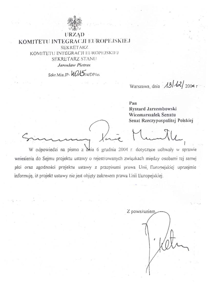 - w Kodeksie rodzinnym i opiekuńczym dodano przepis, zgodnie z którym uczestnictwo w rejestrowanym związku osób tej samej płci stanowić będzie przeszkodę małżeńską,