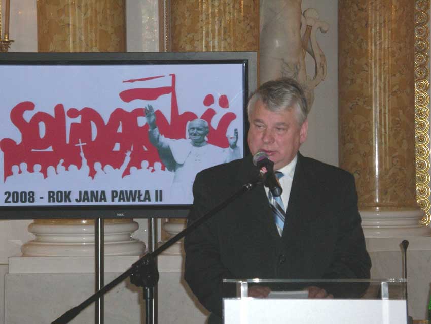 W wyst膮pieniu Bogdan Borusewicz powiedzia艂 mi臋dzy innymi: "Spotykamy si臋 w przededniu kolejnej rocznicy Porozumie艅 Gda艅skich. Rocznicy narodzin Solidarno艣ci. Na temat genezy i znaczenia tego ogromnego ruchu powiedziano i napisano ju偶 bardzo wiele. Wiele powiedziano te偶 na temat wp艂ywu Jana Paw艂a II i Jego nauczania na Solidarno艣膰. Rozwa偶aj膮c wielorakie zwi膮zki Jana Paw艂a II z Solidarno艣ci膮 warto jednak pami臋ta膰, 偶e by艂 to zwi膮zek owocny dla obu stron. Papie偶 da艂 nam nadziej臋 i si艂臋. Solidarno艣膰 "silna papie偶em" sta艂a si臋 no艣nikiem Jego idei. Unikanie przemocy, odrzucenie w imi臋 solidaryzmu marksistowskiej "walki klas" pozwoli艂o Solidarno艣ci wpisa膰 si臋 w pontyfikat Jana Paw艂a II. Dla Papie偶a Solidarno艣膰 sta艂a si臋 niejako narz臋dziem nowej ewangelizacji. Papie偶 przetransponowa艂 idee Solidarno艣ci, wyeksponowa艂 jej uniwersalny wymiar. W 1995 roku w przem贸wieniu wyg艂oszonym na sesji Organizacji Narod贸w Zjednoczonych Jan Pawe艂 II m贸wi艂: "w ci膮gu ostatnich kilkunastu lat nast膮pi艂o niezwyk艂e w skali ca艂ego globu poszerzenie przestrzeni wolno艣ci. To d膮偶enie do odzyskania i zdobycia wolno艣ci jest jedn膮 z pot臋偶nych si艂 kszta艂tuj膮cych histori臋. Fenomen ten nie ogranicza si臋 do jakiej艣 jednej cz臋艣ci 艣wiata, ani nie jest rysem jednej tylko cywilizacji czy kultury".