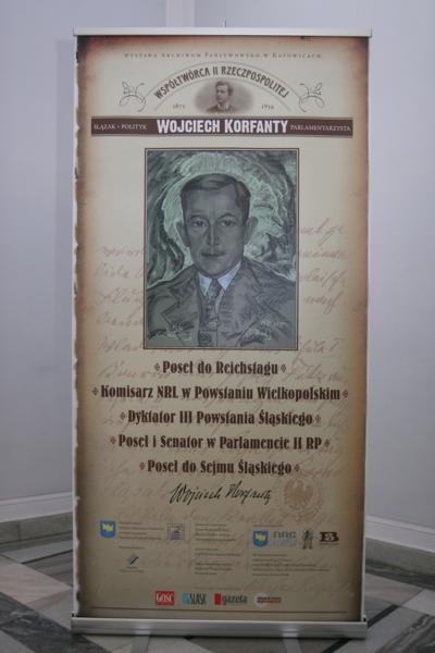 Na Śląsku rok 2009 został ogłoszony Rokiem Wojciecha Korfantego, postaci niezwykle ważnej w dziejach Górnego Śląska - przywódcy zwycięskiego III powstania śląskiego, parlamentarzyście. Ekspozycja zaprezentowana w Senacie ukazuje kolejne etapy jego życia i działalności: dzieciństwo i młodość, działalność jako posła do niemieckiego Reichstagu i pruskiego Landtagu, między Poznaniem a Warszawą. W. Korfanty był także komisarzem Polskiego Komisariatu Plebiscytowego, przywódcą III powstania śląskiego, w rządzie RP - kandydatem na stanowisko premiera, wicepremierem rządu, przywódcą Chrześcijańskiej Demokracji, zasiadał w Sejmie Śląskim, był redaktorem "Polonii". Na wystawie ukazano też konflikt z sanacją, proces brzeski, emigrację, życie prywatne i śmierć tego wybitnego Polaka. Wystawie towarzyszą obszerne komentarze przygotowane przez historyków. Wśród prezentowanych dokumentów znajdują się m.in. wyborcza ulotka kpiąca z pobożności Korfantego, gdy ten kandydował do parlamentu jako polityk Chrześcijańskiej Demokracji, kopia dziennika "Polonia", którego Korfanty był założycielem i redaktorem naczelnym, a także kopia jego francuskiego paszportu konsularnego z okresu emigracji we Francji.