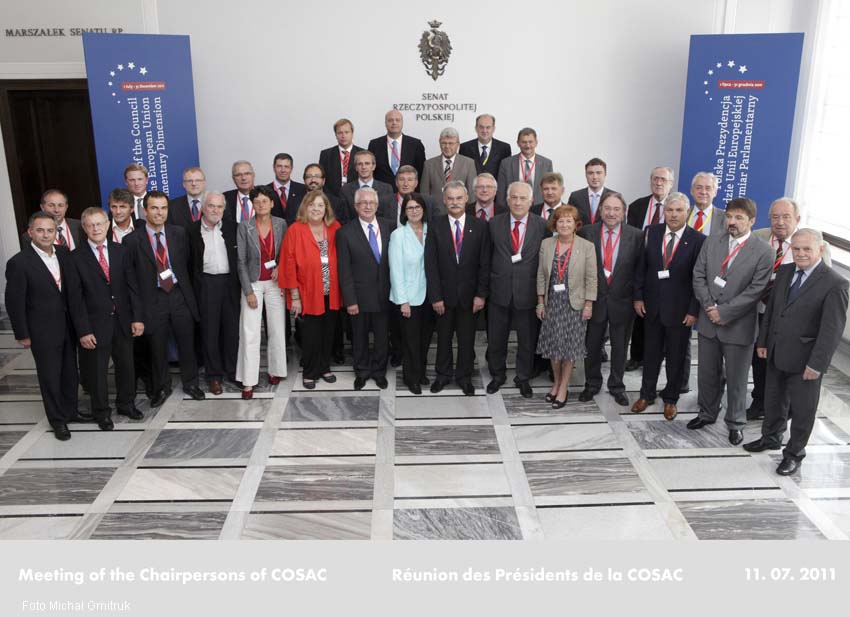 10-11 lipca 2011 r. w Senacie w ramach parlamentarnego wymiaru polskiego przewodnictwa w Radzie UE odbyło się spotkanie przewodniczących komisji do spraw europejskich parlamentów państw członkowskich UE (COSAC). Wzięli w nim również udział przedstawiciele parlamentów krajów kandydujących: Chorwacji, Czarnogóry, Islandii, Macedonii i Turcji. Spotkanie miało na celu przygotowanie październikowej plenarnej XLVI konferencji COSAC, która odbędzie się w 2-4 października 2011 r. Rozmawiano również na temat roli instytucji UE wobec konfliktów na jej zewnętrznych granicach. Spotkanie przewodniczących poprzedziło zebranie Trojki Prezydencji COSAC (przedstawiciele Polski, Węgier, Danii oraz Parlamentu Europejskiego), które odbyło się 10 lipca. Omówiono na nim m.in. program spotkania plenarnego COSAC i założenia 16. półrocznego raportu COSAC.